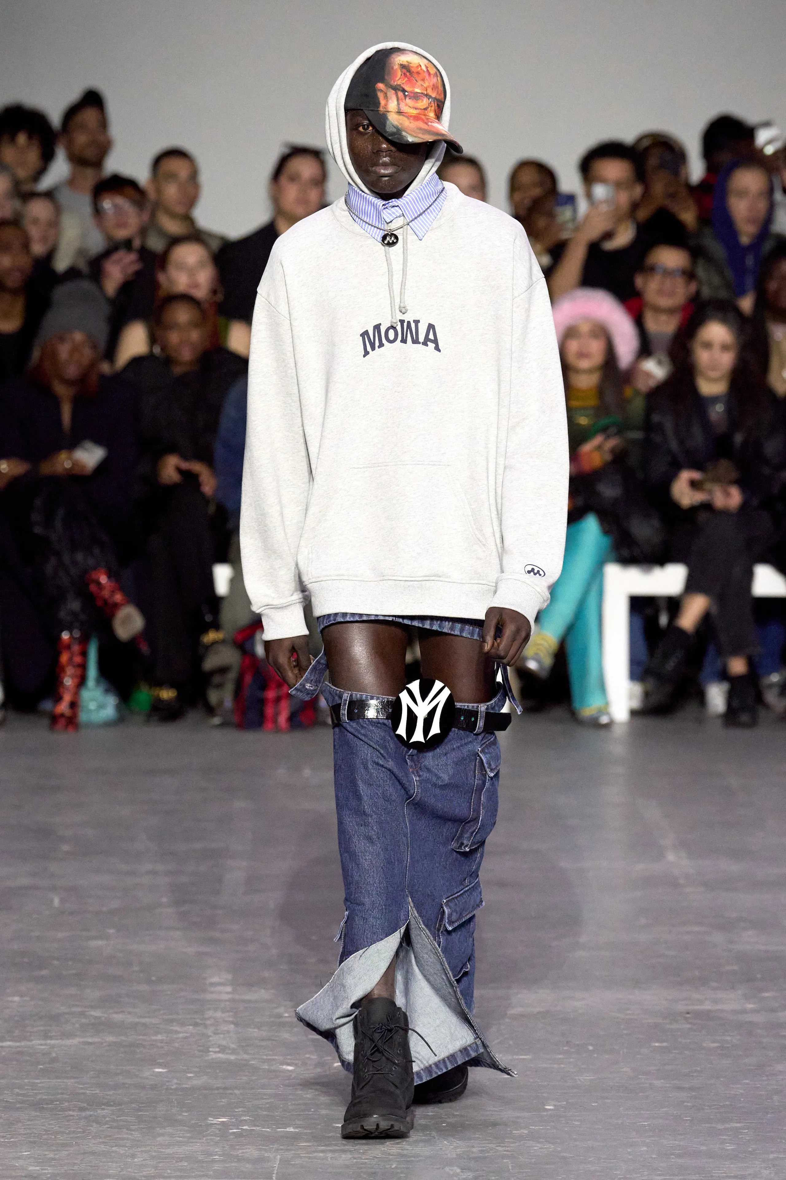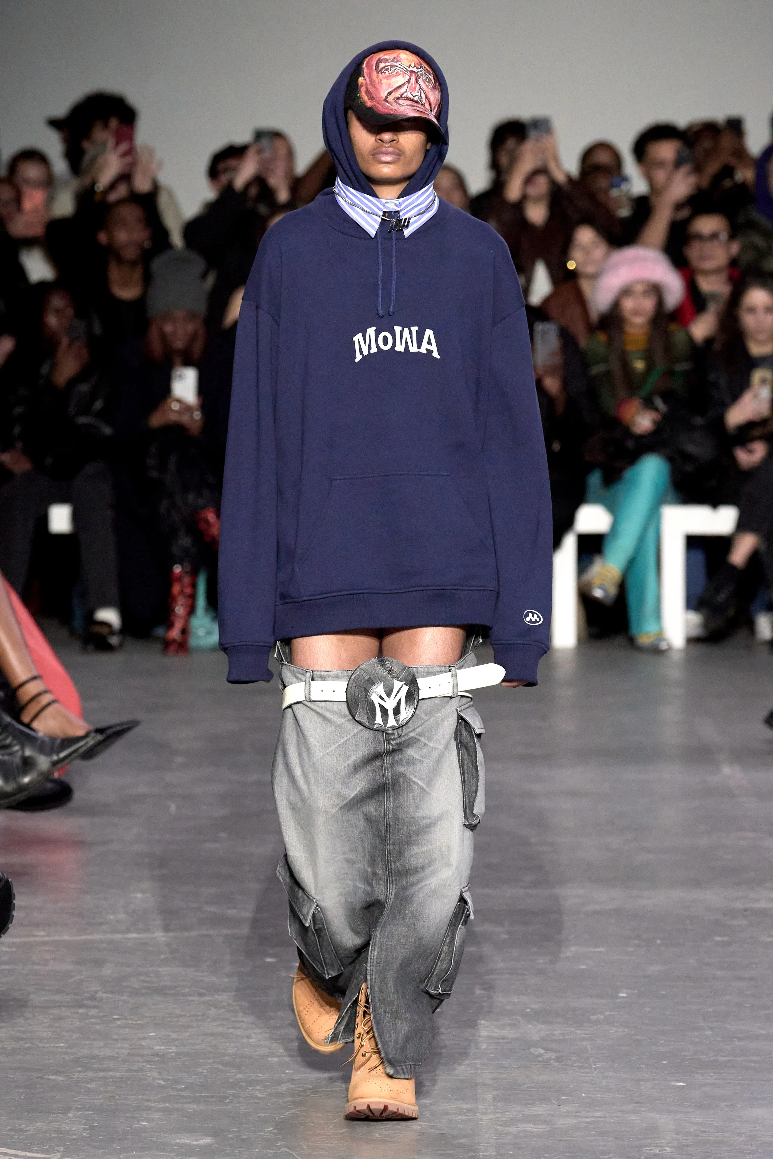 New York-inspired collections have been a common theme this season, and Mowalola is no exception. MoMa-inspired merchandise redesigned as “MoWa,” along with Yankee emblems across belt buckles and windbreakers, were just a few of the tributes to the NYC culture Mowalola brought to Britain. Playing with textures, Mowalola used leather and denim textiles to give outfits an edge while adding cutouts in less commonly seen places like the crotch with jean skirts that hang at the knees or lower stomach with a slit just below a printed “insert disc here,” longer pants revealed skin where pockets would be, and short leather skirts detailed with cut out rectangles all the way around.