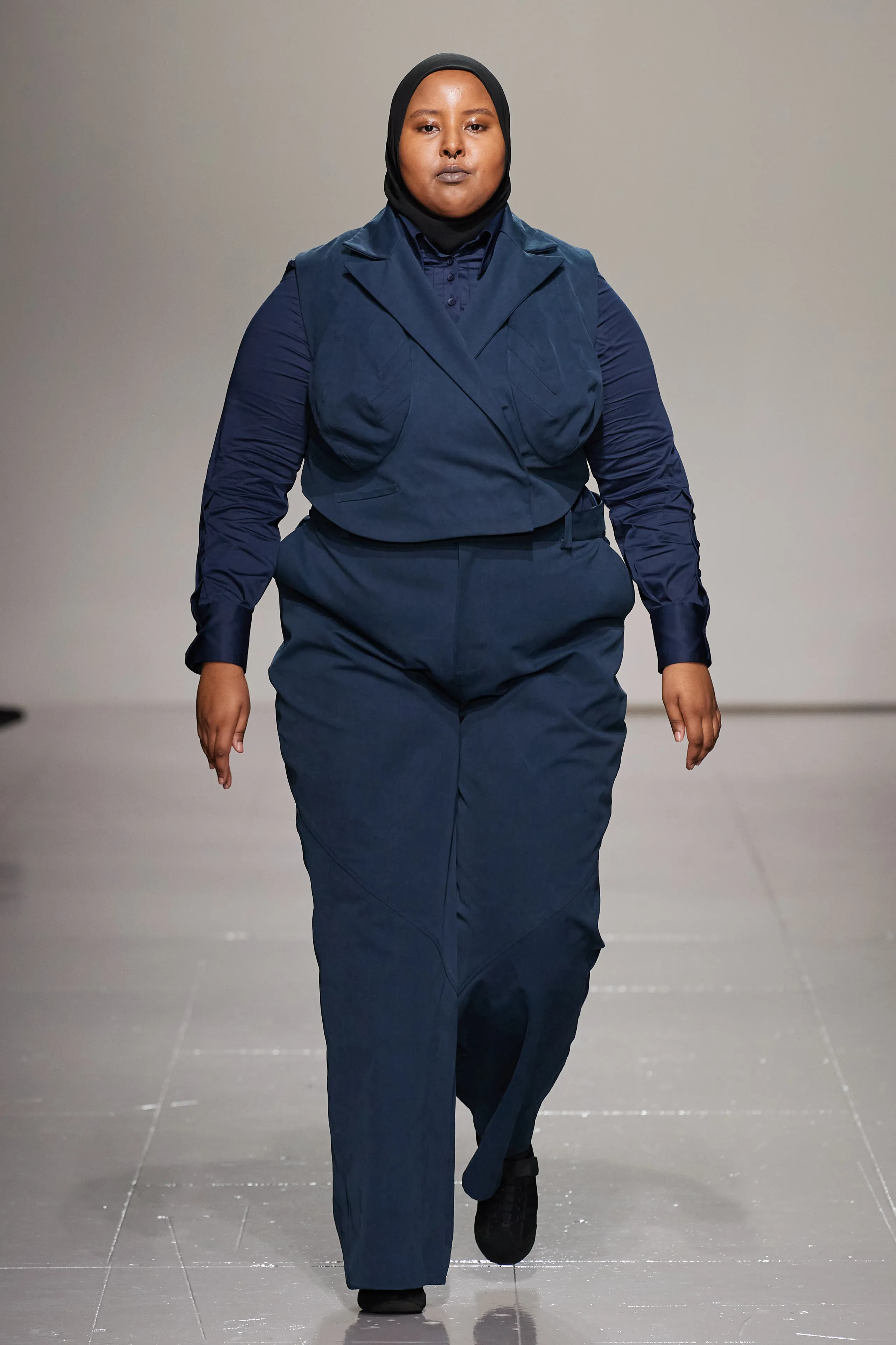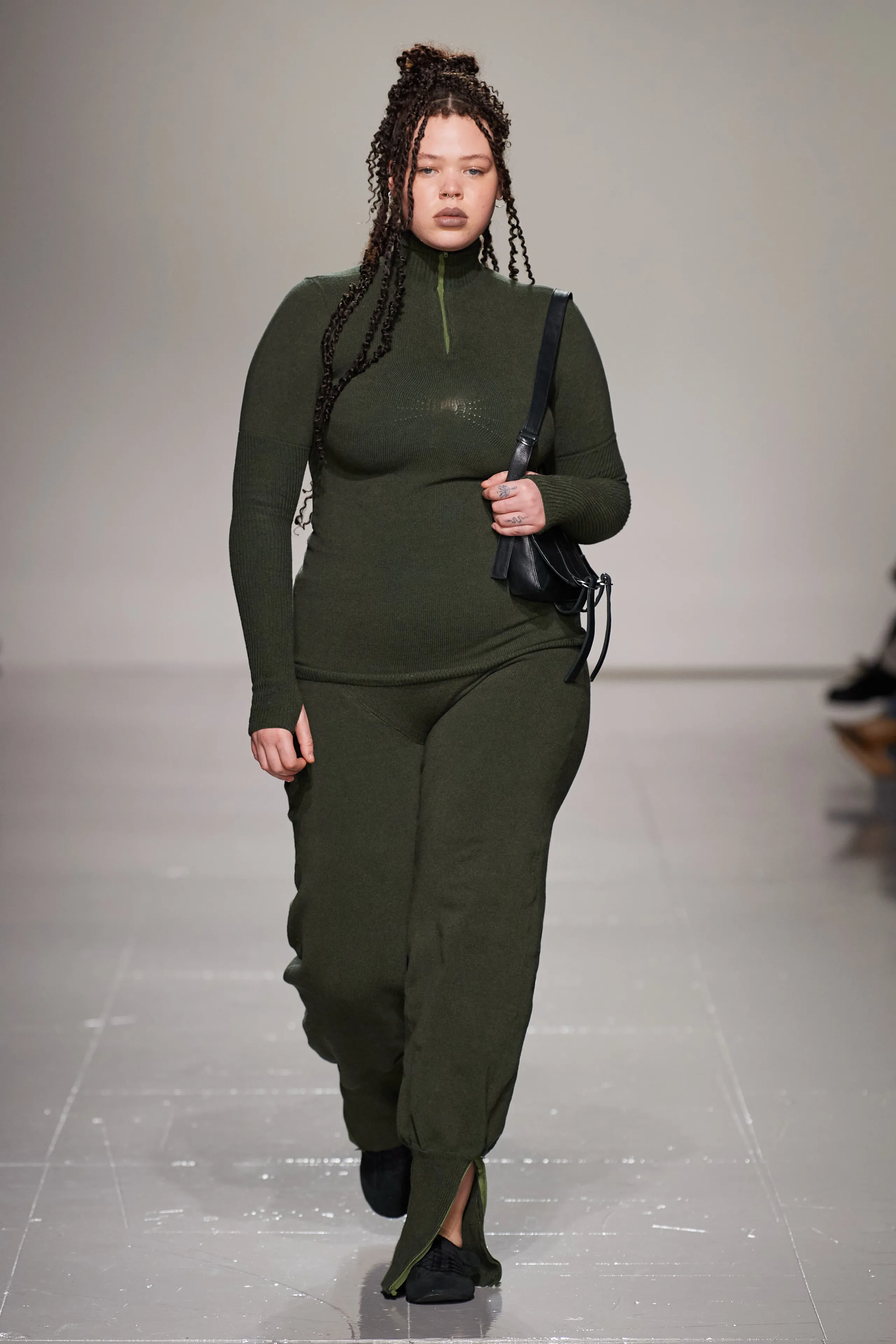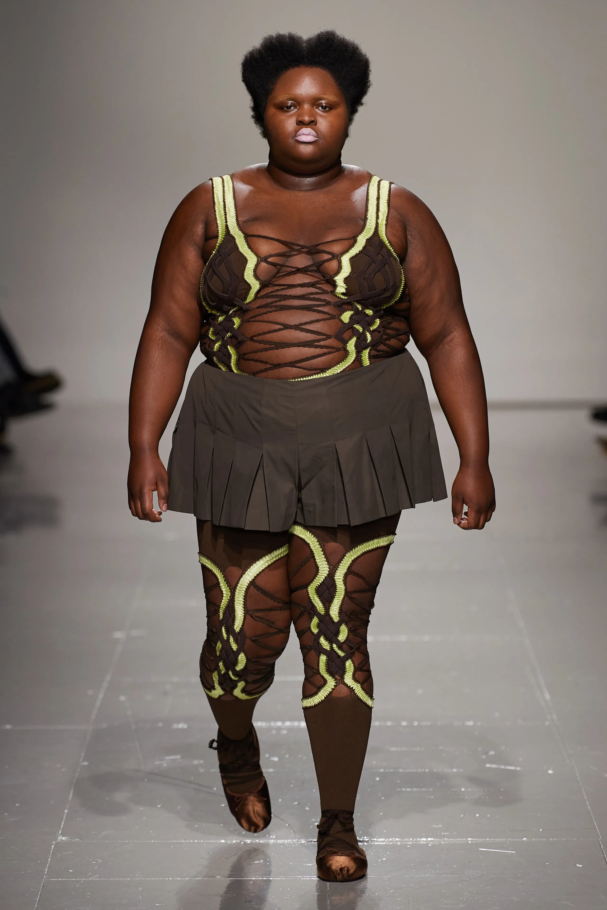 Sinead O’Dwyer continues to show us that her clothes are for everybody to wear. She prioritizes inclusivity. Her most recent collection was inspired by her grandmother's closet, the collection features the professional elegance of a box pleated skirt while contrasting with a mini neon pink silk dress cut out and weaving around the chest. O’Dwyer named the collection “Dúil” for desire. She wanted the looks to emulate lust, romance, and longing, making the wearer feel wanted and giving the viewer more to desire. Runway looks are typically designed for one size, so using models who are all different sizes means that the designer has to craft and sew these looks specifically for the model, not just for any size 14 body. A pregnant model wore a brown bodysuit detailed with silver lining and cut out around her stomach, models of every skin color and size wore navy blue trench coats and cut-out tights weaving up their legs in neon green, neon yellow, and brown. O’Dwyer is returning fashion to its intended roots, for the body to be worn on everyone and anyone.