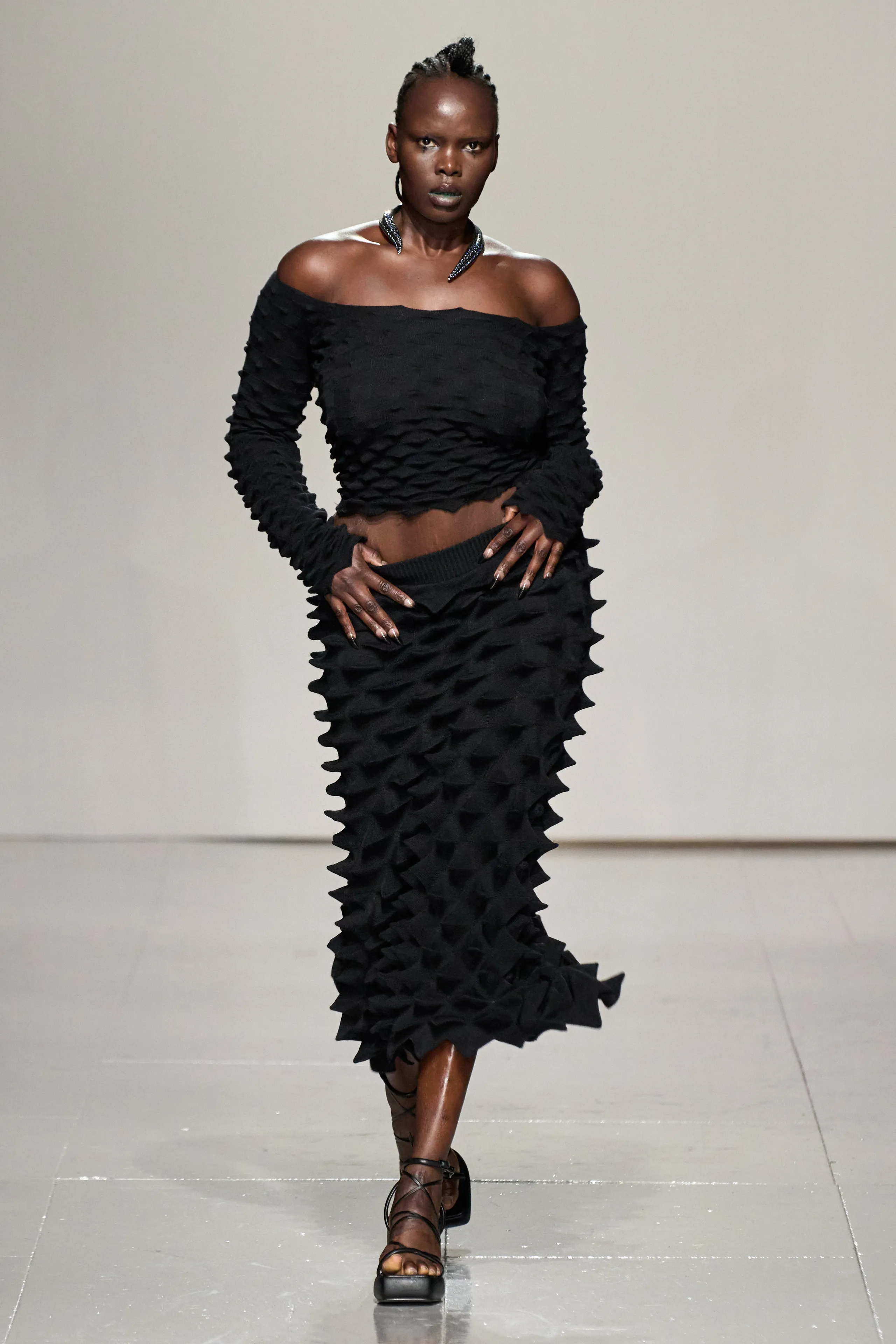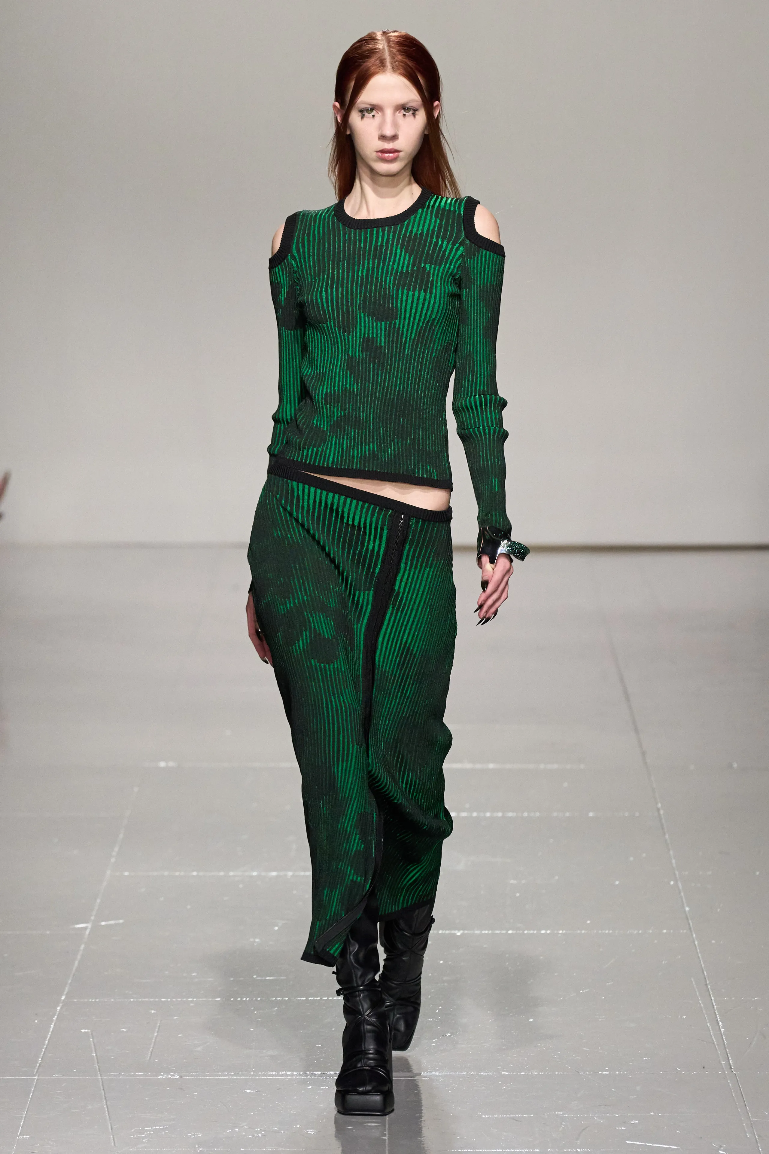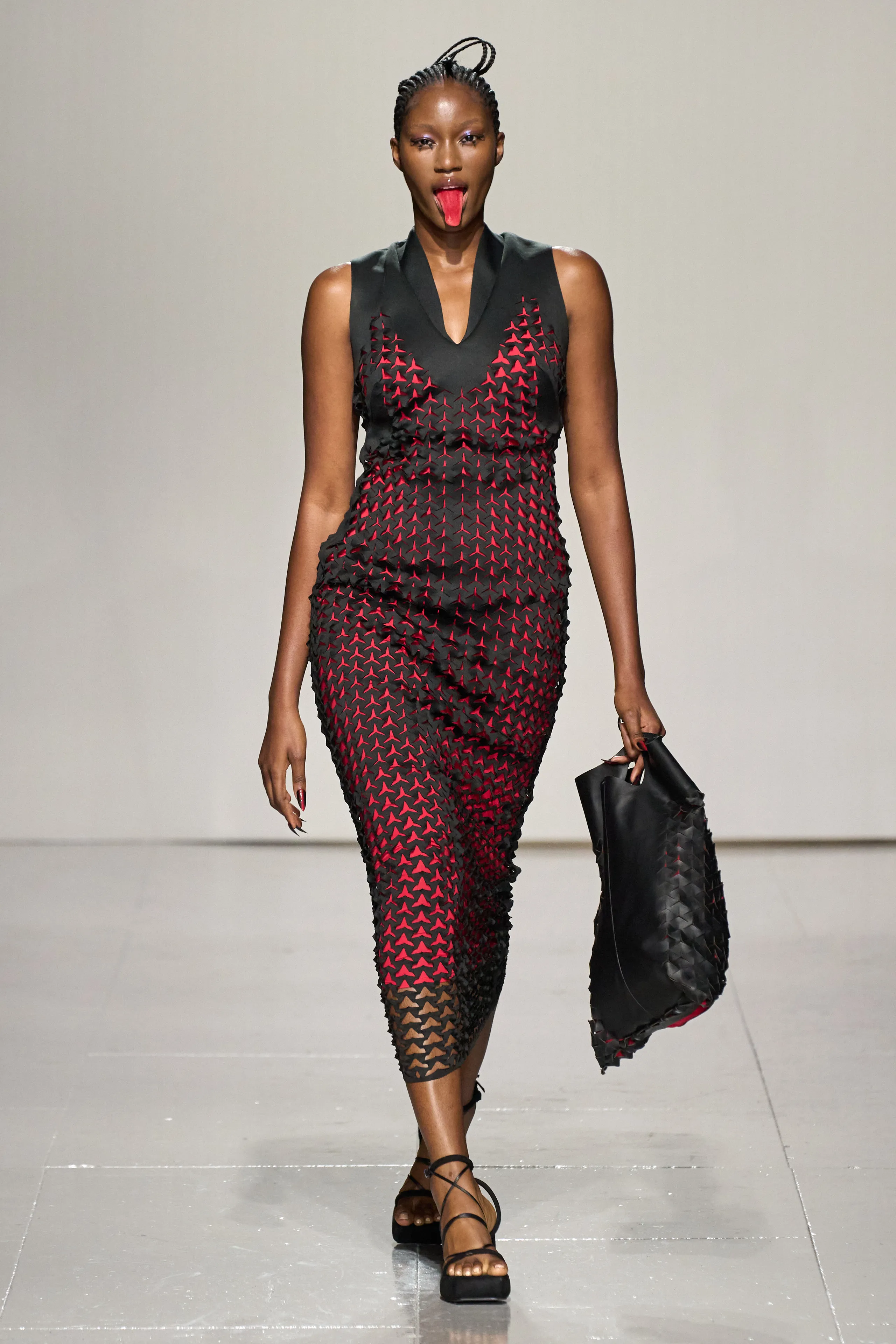 Priya Ahluwalia’s LFW appearance took place on the second day of fashion week. Live 90’s RnB blasted down the runway while her latest collection, inspired by her Indian-Nigerian heritage, showcased a “greatest hits” moment that had everyone talking. Every piece was carefully tailored with a bold color palette of jewel tones. Known for her color theory in her collections, Ahluwalia’s knitwear and co-ords were fluid in the tailoring across the body, meant to be relaxed for the everyday wearer. Even more, targeted towards Gen Z, Ahluwalia’s collaboration with Microsoft added an element of tech to the designs, allowing people who wear the clothes to scan a QR code printed on them to see the song that inspired each piece.