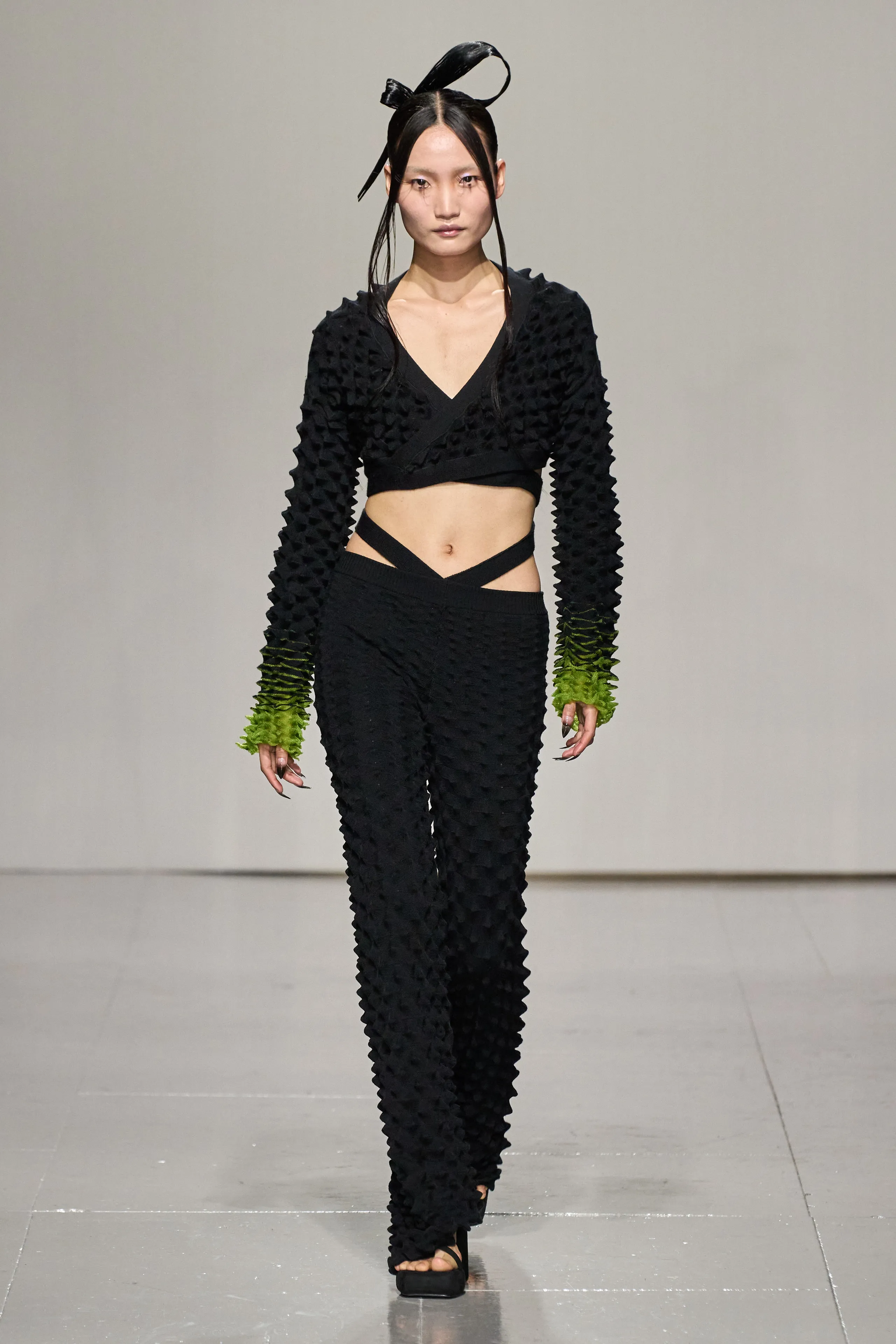 Bringing puckered fabric back to life once again, Chet Lo took a spin off its last bold and colorful line to showcase a darker, almost foreboding collection. Lo’s most recent collection was inspired by a more tumultuous time in his life, and the clothes reflect that in color and design. He calls the pops of color used “strategic” in a sense that they were deliberately placed to symbolize the moments of light in times that feel darker. Many of the looks were monochromatic black but none looked similar, each model wore different combos of puckered long sleeves and puckered bottoms. Emulating that almost gothic aesthetic, glaring anime eyes were emblazoned across t-shirts, while a mesh shawl was styled with a gradient black to purple skirt. Debuting last September, Lo is making a big name for himself as an upcoming designer.