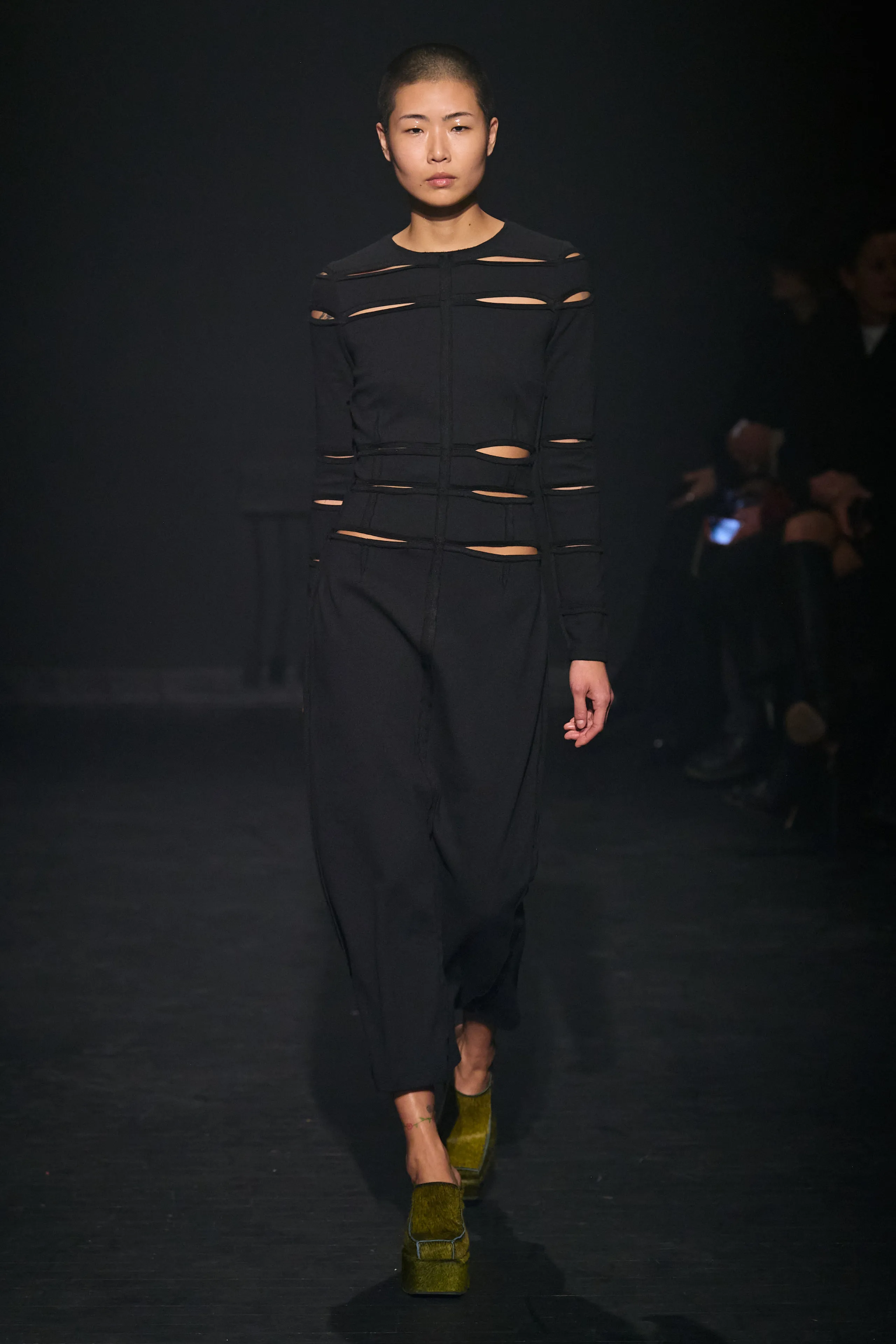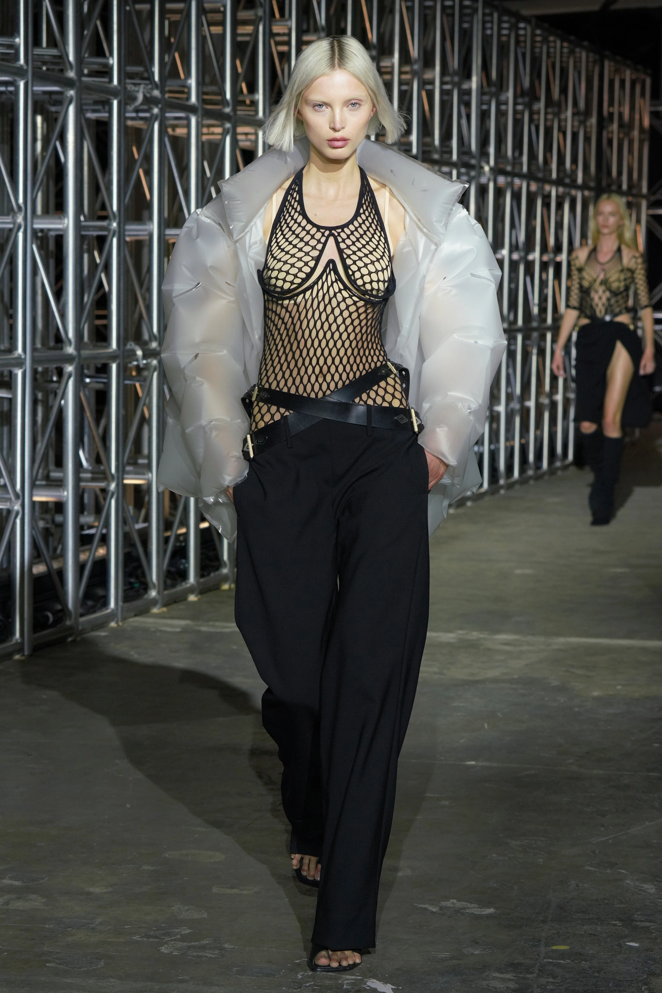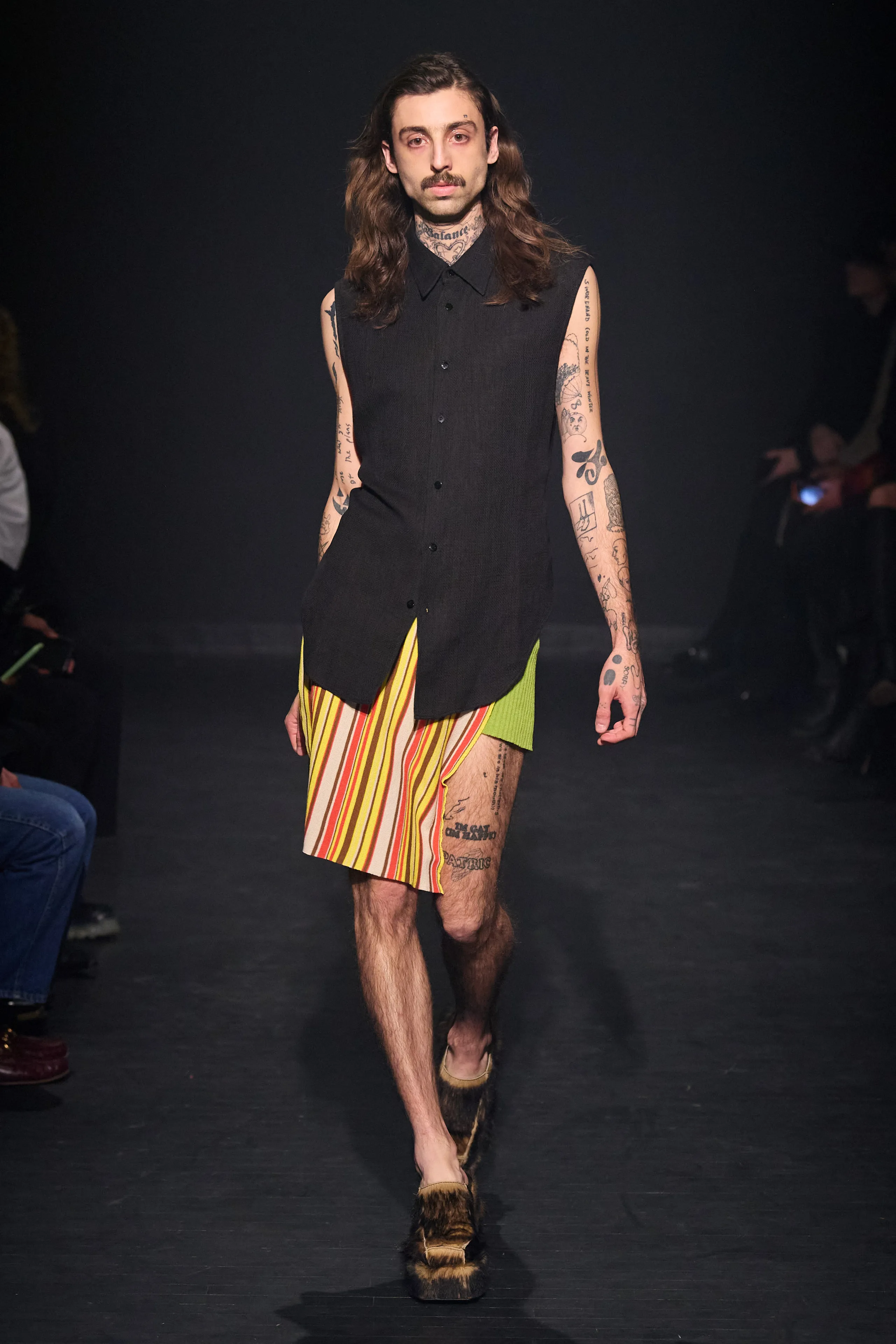 Beginning with the darker pieces in their collection, Zoe Latta and Mike Eckhaus know how to craft a show. As lighter pieces in their capsule headed down the runway artful tailoring could be seen in the gradient pallet of the pieces. Prioritizing fluidity in fashion, many pieces were androgynous with the idea that fashion expression is the purest of them all. White Lotus star John Gries made his fashion week debut appearance in baggy white pants and a pastel lime knit sweater with ink blottings across the front. The show was inspired by the quote “Culture shapes the scripts that expressions of distress will follow”, and in that fashion, models wore an array of functional, casual, and formal wear. Utilizing mesh, fur, and many other textures Eckhaus Latta brought the idea of fluidity to life with a real essence for everyday wear.