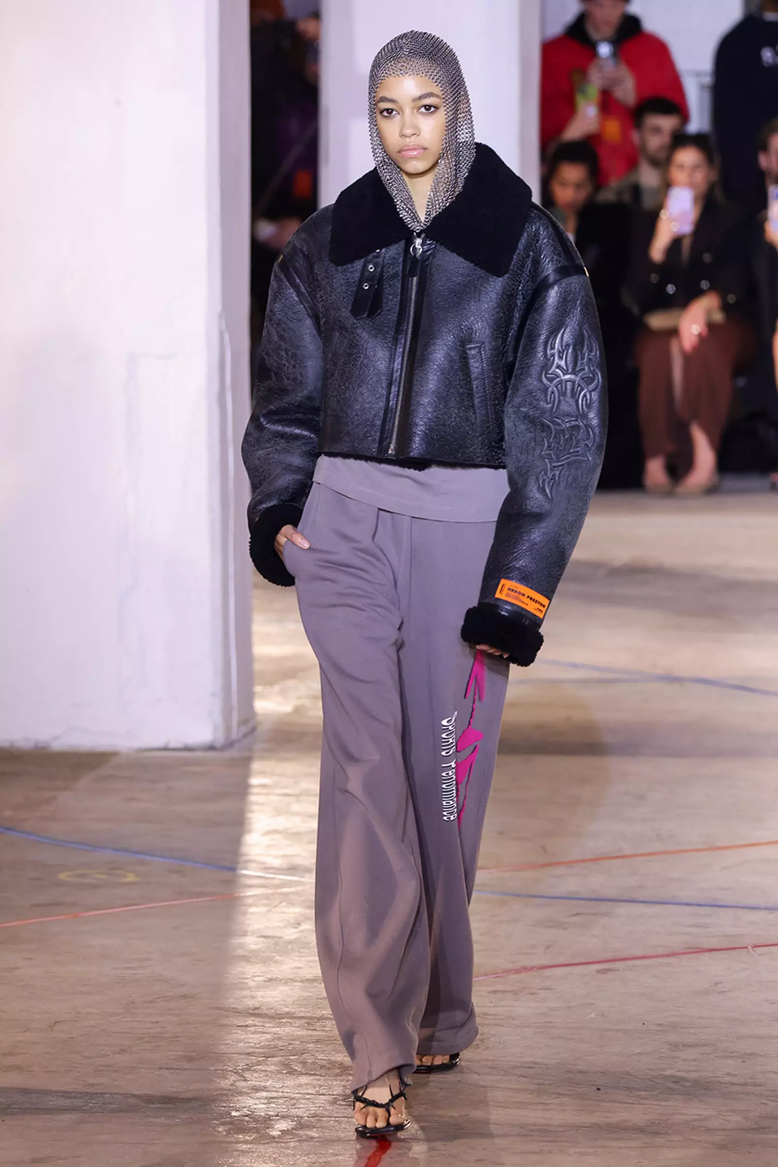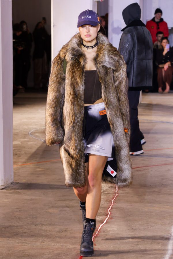 Heron Preston debuted at NYFW this year, growing up in New York and beginning his fashion career in the city made his debut a true homecoming, especially for many of his friends and family who have never seen one of his shows. In the essence of a New York-inspired show, the models walked down a concrete runway with looks featuring an industrial, utilitarian aesthetic. Preston designed his signature streetwear looks with buckles, belts, leather, and chainmail, and opened up the show with “construction workers” wearing neon orange vests spray painting a runway between aisles of chairs. With the idea of a specific community in mind, he wanted to incorporate “New York” into his designs and even used some found objects from the city. As a part of his sustainability-focused brand, much of his outerwear used recycled nylon to bring to life his passion for environmentalism.