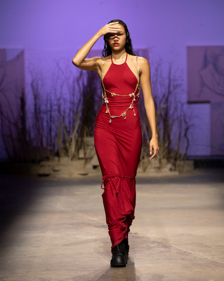 DI PETSA's signature drapery took on new life in flowing silks and vibrant degradé meshes, with prints that evoke fading tan lines and the lingering warmth of summer. Period blood motifs featured boldly across several pieces, notably the “Blood Masturbation Denim” trousers, challenging societal narratives surrounding female bodily fluids. Models, their hands blood-stained and hair entwined with sand, exuded a raw, ethereal sensuality that captured the collection’s themes of intimacy and self-acceptance.