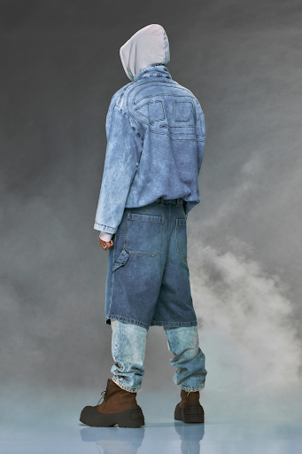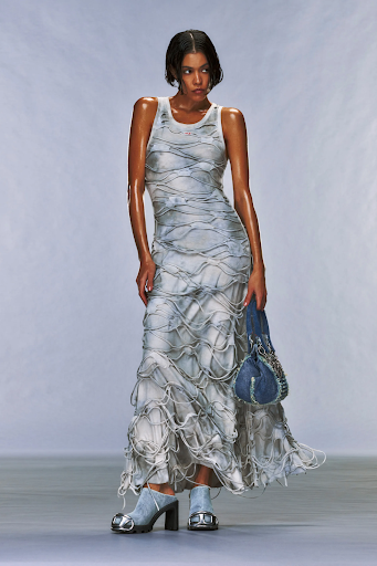 If there’s one thing we can count on Diesel for, it’s their reimagination of denim collection after collection - and their Pre-Fall for the coming year didn’t fail with the dreamiest faded blue selections in fresh, innovative silhouettes. Slightly futuristic and unapologetically stylish, this collection doesn’t just explore sequined denim skirts, denim clogs, and Glenn Martens’ version of a Canadian tux but further merges the ensemble with pops of neon tones while contrasting with solely black leather Matrix-esque looks. This fun new drop is seemingly focused on layering for the Fall weather with shiny denim leggings underneath a raw jort, or plaid mini skirts over jeans slightly encompassed by an oversized jacket; Diesel’s fusion of styles is the perfect high fashion streetwear you’ll feel as cool as you look wearing. Although baggy and oversized fits don’t typically scream sexiness, Martens somehow executed that feel in a contemporary light through his understanding of textures and shapes, as well as with the most chic mini dresses scattered about.