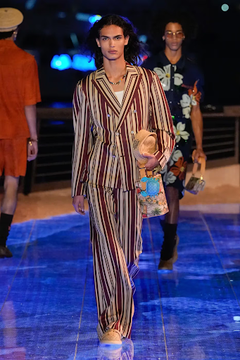Pharrell’s first menswear Pre-Fall collection for Louis Vuitton is adventurous to say the least, blending tropical design with big city streetwear takes us on a venture where heritage and traditions are what drive inventive fashion. Inspired by the ideation of a Hong Kong businessman on vacation in Hawaii who is forced to return back for a day to make a meeting, the collection delivers Pharrell’s “future of chic” with exotic colorways, patterns and shade pairings on a formal suit. The skate culture now embedded in Louis Vuitton’s designs thanks to Virgil Abloh was widely prevalent in the show and recentered in a contemporary dapper man that Pharrell is infatuated with. Sailor hats, baseball jackets and raffia accessories were all tweaked with details of LV Aloha prints, pearls and wire-edged flowers to illustrate the archetype of a surfer businessman fusion that lives in the city and beyond.
